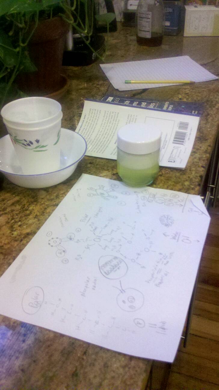 Today we talked about polar and non-polar molecules and how soap works. I even tried to throw in cell membranes and the phospholipid bilayer but I think that may have been a bit too much. The experiment worked well - water and oil in a jar and then added in soap. I love kitchen chemistry.